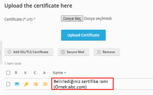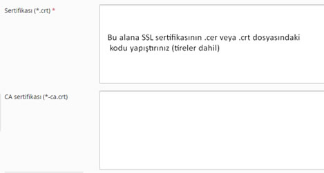 - Sertifikayı yükleyebilmeniz için birden fazla yöntem bulunmaktadır. İsterseniz “Select File” bölümünden sertifikanızı dosya olarak yükleme işlemi sağlayabilirsiniz isterseniz de sertifika dosyanızı (.cer veya .crt) bir notepad programı ile açıp içerisindeki kodu (tireler dahil olmak üzere) kopyalayarak .CRT kutucuğuna yapıştırabilirsiniz. Bu işlemden sonra “Upload Certificate / Sertifikayı Karşıya Yükle” butonu ile sertifika yükleme işlemini gerçekleştirebilirsiniz.