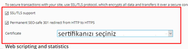 - SSL/TLS support ve Permanent SEO-safe 301 redirect from http to HTTPS yazılarının yanında yer alan kutucukları işaretleyerek Certificate bölümünden sertifika isminizi seçerek “OK” butonu ile SSL işlemlerinizi tamamlayabilirsiniz.