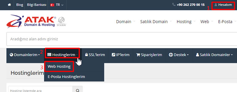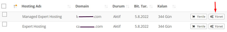 - Plesk Panel’e erişim sağlayınız. Eğer firmamızda bulunan bir Hosting paketiniz mevcut ise öncelikle hesabınıza erişim sağlayınız. Hesabım> Hostinglerim> Web Hosting butonuna tıklayarak açılan sayfadan Hosting hizmetinizin “Yönet” butonuna tıklayınız.