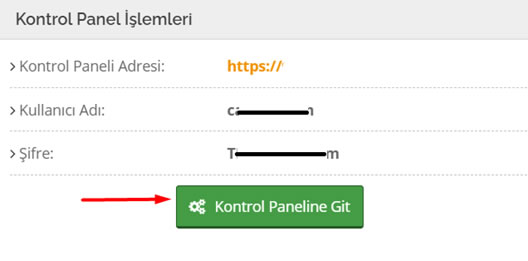 Yönet butonuna tıkladıktan sonra Plesk Panel’e geçiş sağlayabilmek için yeşil renkli “Kontrol Paneline Git” butonuna tıklayınız.